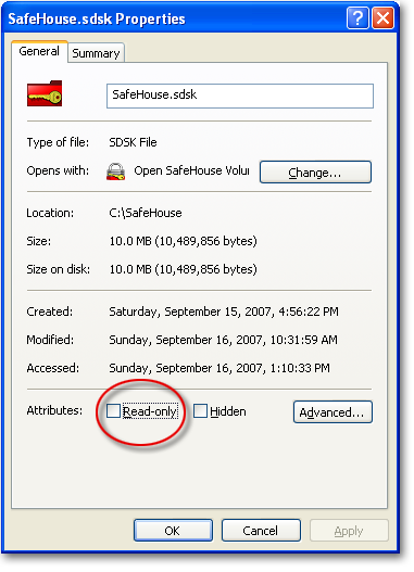 This setting, which is viewed and changed using Explorer, is fully honored by SafeHouse. As such, if your volume file is marked as read-only, you will still be able to open it, but you will not be able to update any of the files, nor add new files or delete files.