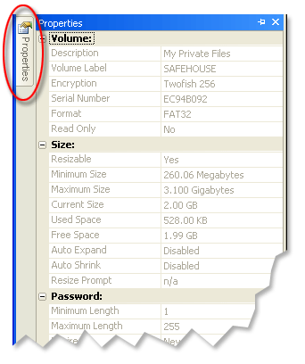 The values shown in the Properties tab are mostly established when volumes are created; although a few, such as available space, are adjusted in real time. Some values are meaningful only for volumes created by one of our other SafeHouse product editions which provide additional features not available in the freely-distributable SafeHouse Explorer software.
